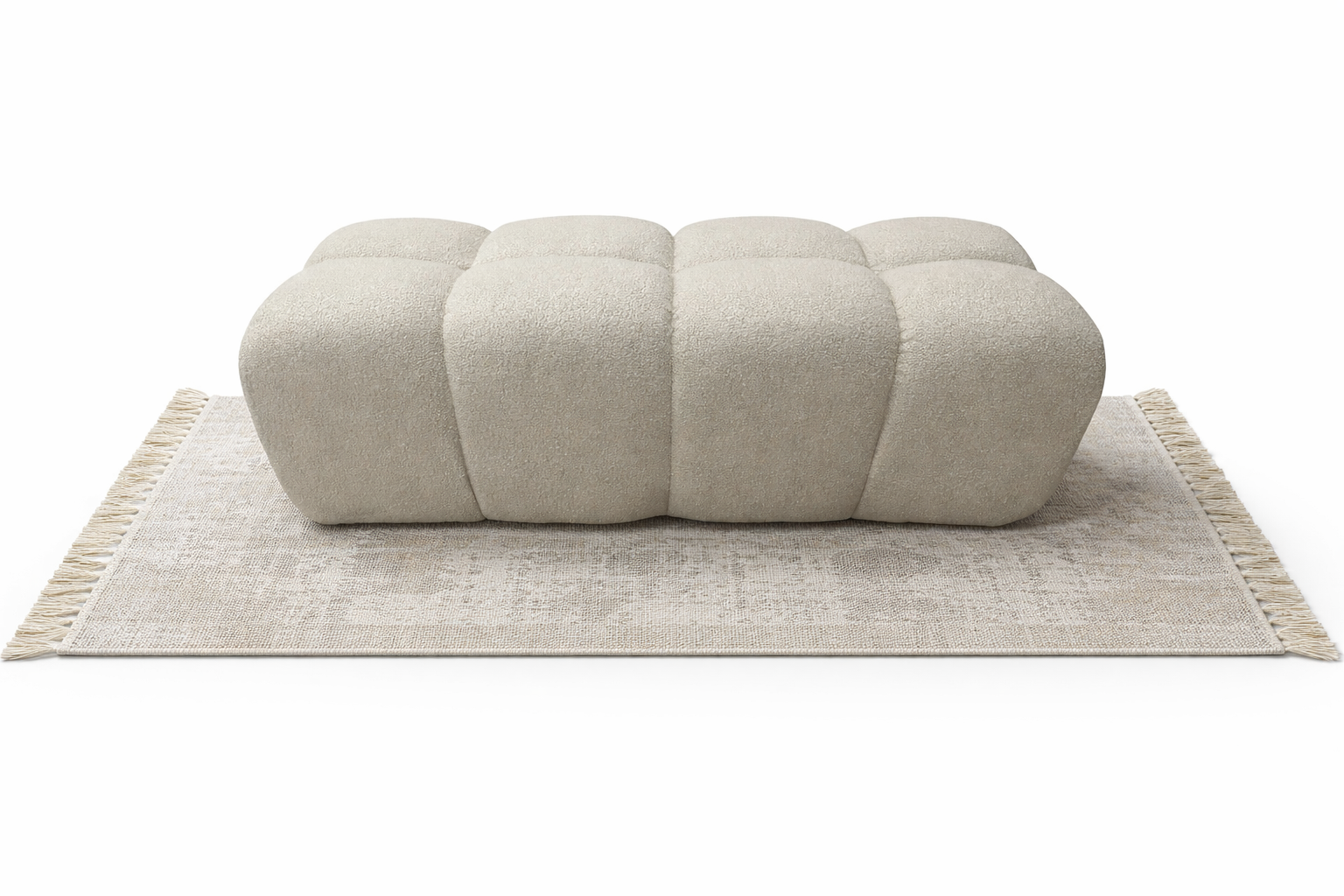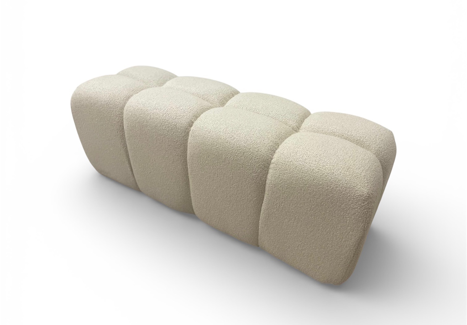 Ez a 120 cm széles puff nem csupán kiegészítő, hanem a tér fókuszpontja. A lágyan tagolt, organikus forma és a finom bouclé kárpit elegáns, mégis barátságos karaktert ad neki. Tökéletes választás nappaliba, hálószobába vagy előszobába – ülőhelyként, lábtartóként vagy dekoratív elemként is megállja a helyét.